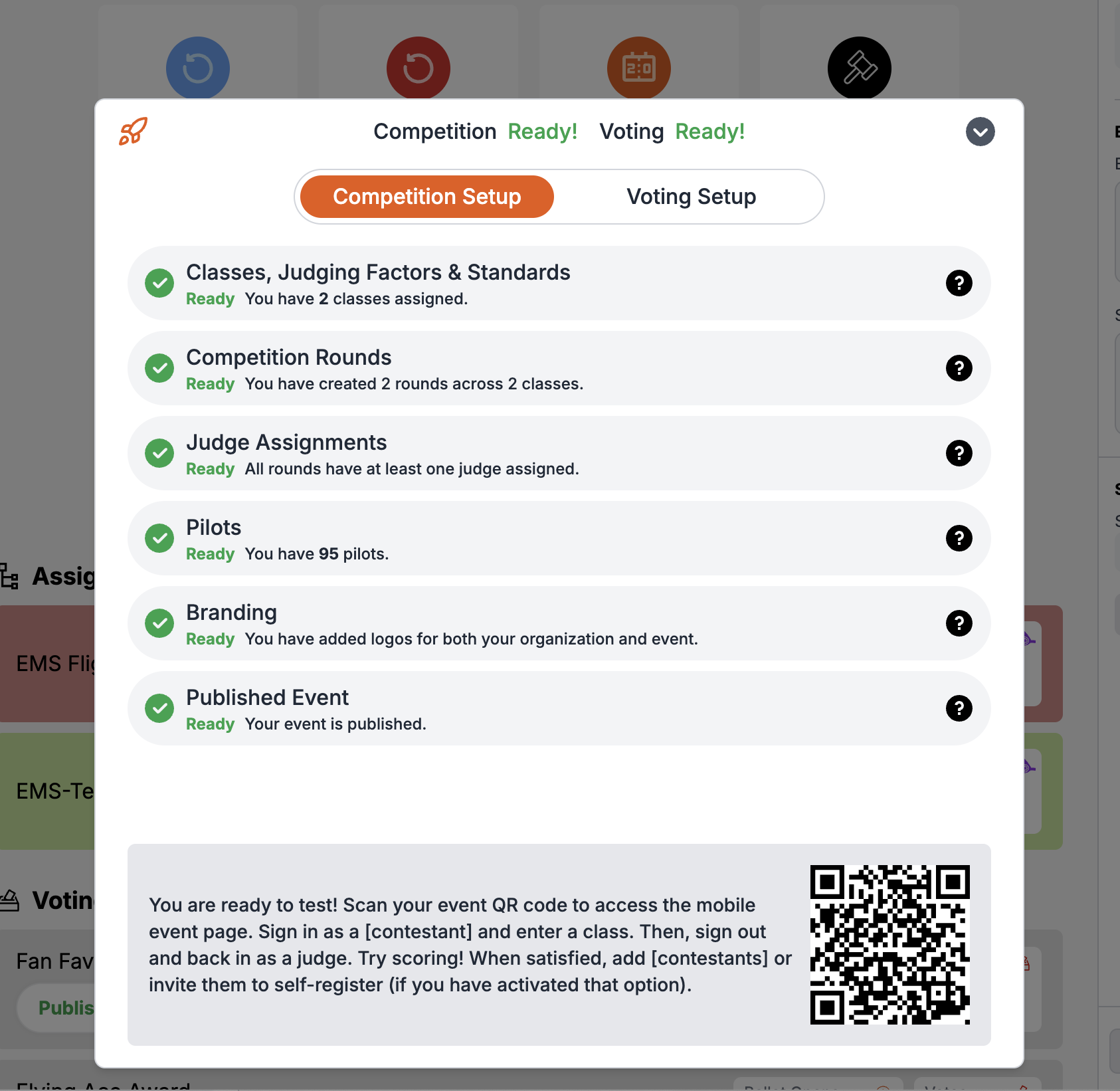 Floating at the bottom of your event-specific screens is a "Launch Status" tile. Clicking on this will expand the tile into a full panel which tells you whether you are on track to host your event with LiveJudge!