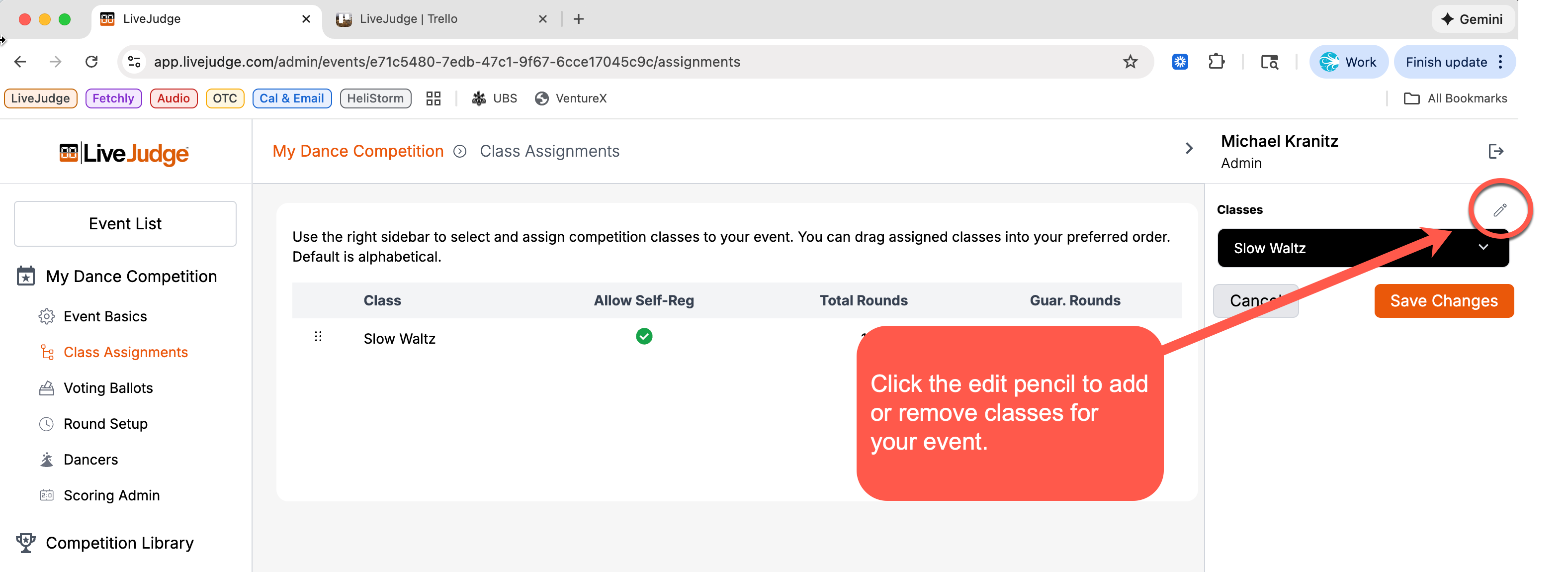 One of the most powerful attributes of the LiveJudge system is its ability to store a library of reusable competition classes and let you pick and choose which classes to have in each event you host. The Class Assignments area is where you choose the classes to include in your event and then set various attributes like the maximum entries in the class (if this is an entry-based event), total rounds, score accumulation, and guaranteed rounds.