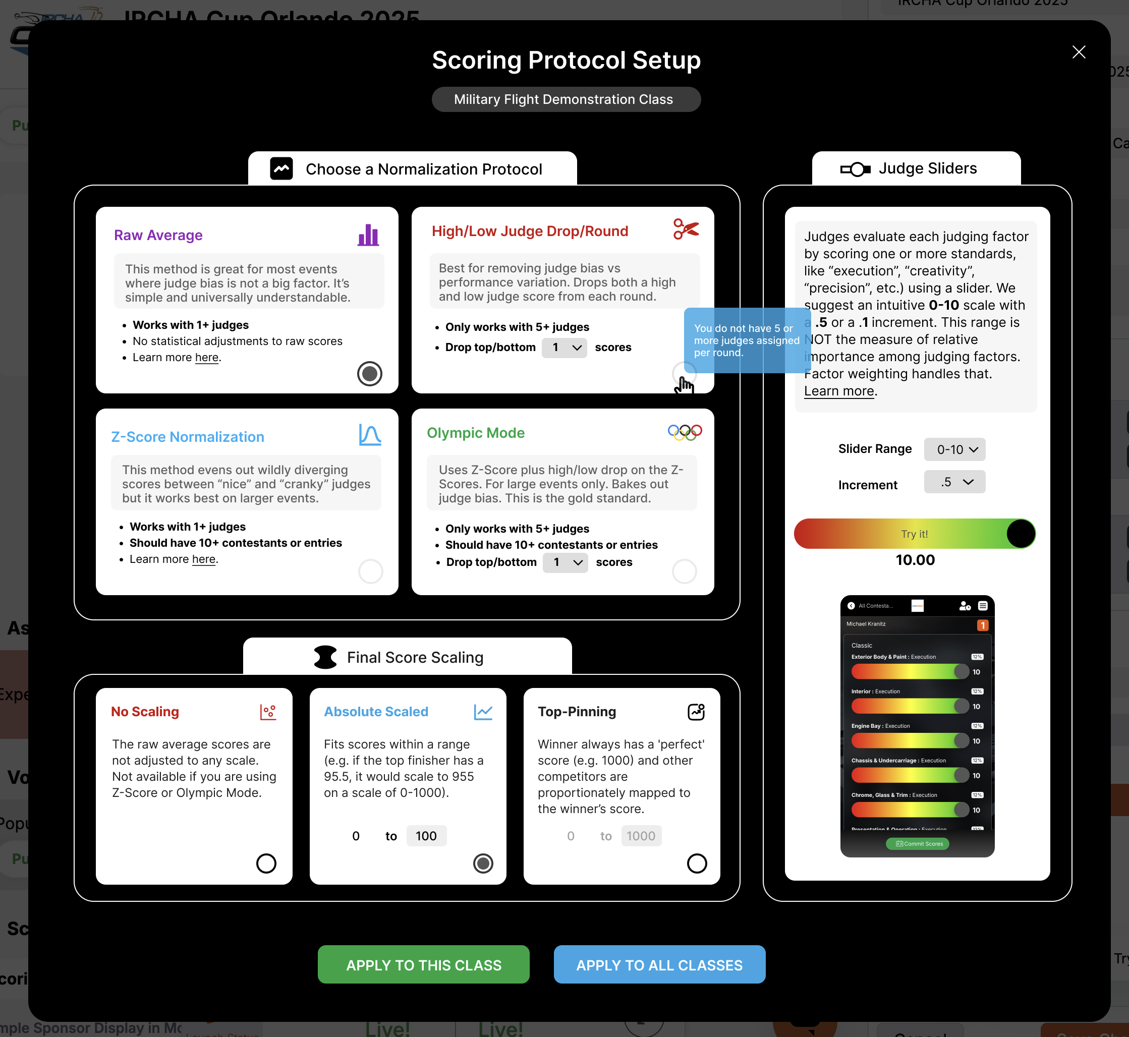 The LiveJudge system allows you to select your preferred normalization, scaling and round-drop rules for each class in your competition class library. This gives you enormous flexibility to run multiple rubrics within and across events. If you always use the same methodology, just set it once within a class and use that class across events.