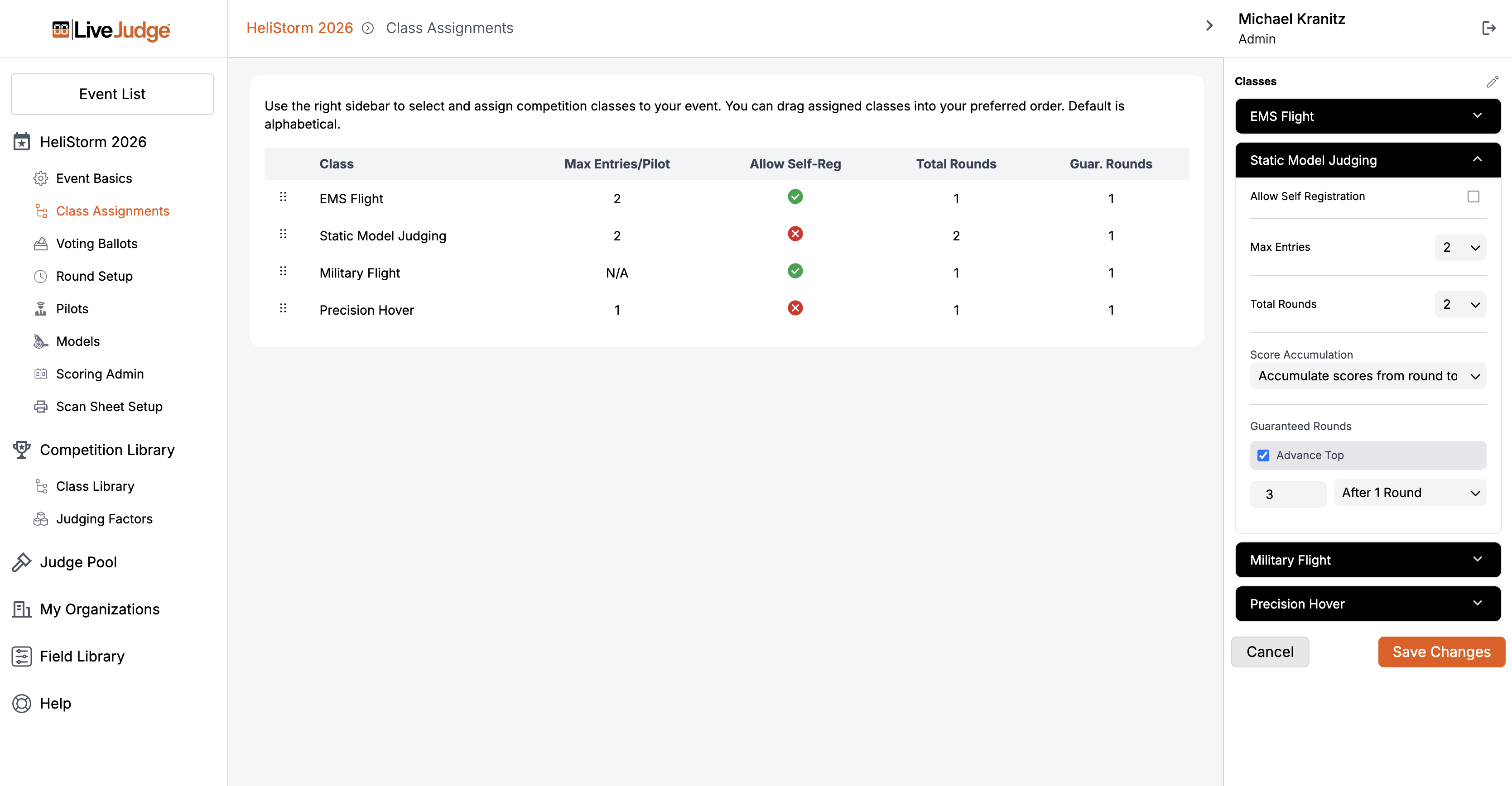 After you have added a class, clicking on its header will reveal options you can set which are specific to the event you are working on. You can create multiple rounds, specify how scores are handled and how many guaranteed rounds you are offering.